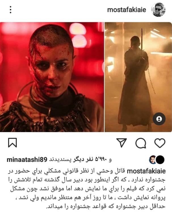 او در این پست اینستاگرامی نوشت: ««قاتل و وحشی» از نظر قانونی مشکلی برای حضور در جشنواره ندارد که اگر اینطور بود دبیر سال گذشته تمام تلاشش را نمیکرد که فیلم را برای ما نمایش دهد اما موفق نشد چون مشکل پروانه نمایش داشت، ما تا روز آخر هم منتظر ماندیم ولی نشد. حداقل دبیر جشنواره که قواعد جشنواره را میداند.»