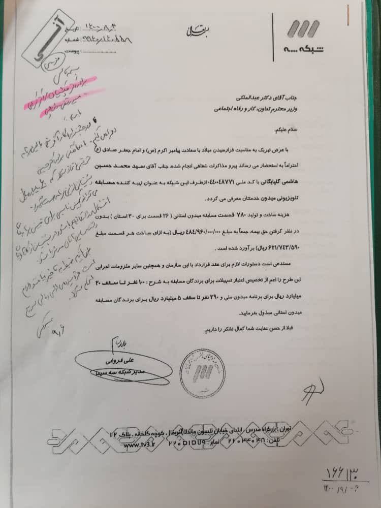 در این نامه علی فروغی مدیر شبکه سه درخواست ۴۸ میلیارد برای برنامه «میدون» کرده است. در پاسخ، عبدالملکی، دستور پرداخت ۶ میلیارد تومان به این مجموعه را می دهد. لازم به ذکر است که عبدالملکی تا چندی پیش یکی از داوران برنامه «میدون» بود.