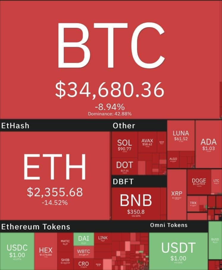بیتکوین با ریزش حدود ۹ درصد به قیمت ۳۴ هزار و ۶۸۰ دلار و اتریوم با سقوط حدود ۱۵ درصد به قیمت ۲ هزار و ۳۵۵ دلار معامله میشوند.
