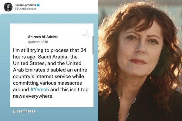 سوزان ساراندون بازیگر سرشناس هالیوود با بازنشر یک توییت در توییترش از شیرین العدیمی دانشیار یمنیالاصل دانشگاه میشیگان به سکوت و سانسور خبری در برابر کشتار مردم یمن اعتراض کرد.