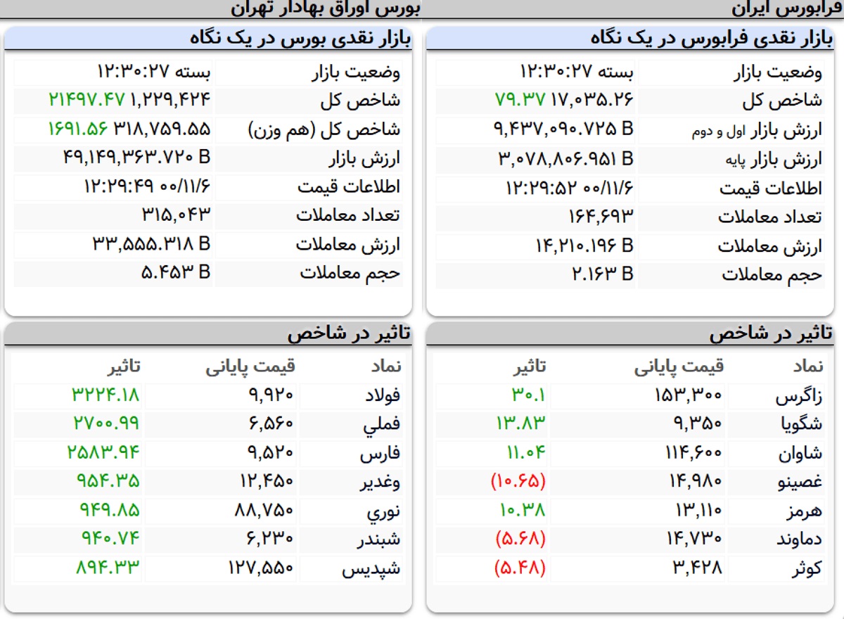 پتروشیمی زاگرس، پتروشیمی تندگویان، پالایش نفت لاوان و فولاد هرمزگان جنوب نسبت به سایر نمادها بیشترین تاثیر مثبت و در مقابل صنعتی مینو، تولید نیروی برق دماوند و بیمه کوثر نسبت به سایر نمادها بیشترین تاثیر منفی را روی فرابورس گذاشتند.