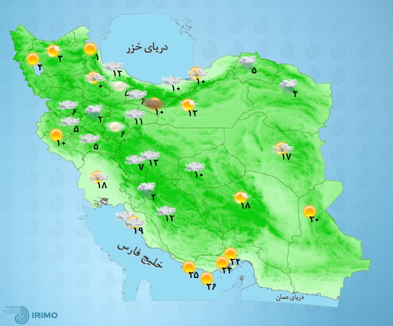 امروز شنبه در مناطقی از غرب، جنوب غرب، بخشهایی از مرکز، جنوب، شرق و جنوب شرق بارش باران و برف و وزش باد و در دامنههای جنوبی البرز، خراسان شمالی و خراسان رضوی بارش پراکنده و وزش باد رخ میدهد. در مناطق جنوبی، رگبار باران و رعد و برق و وزش باد شدید موقتی انتظار میرود.