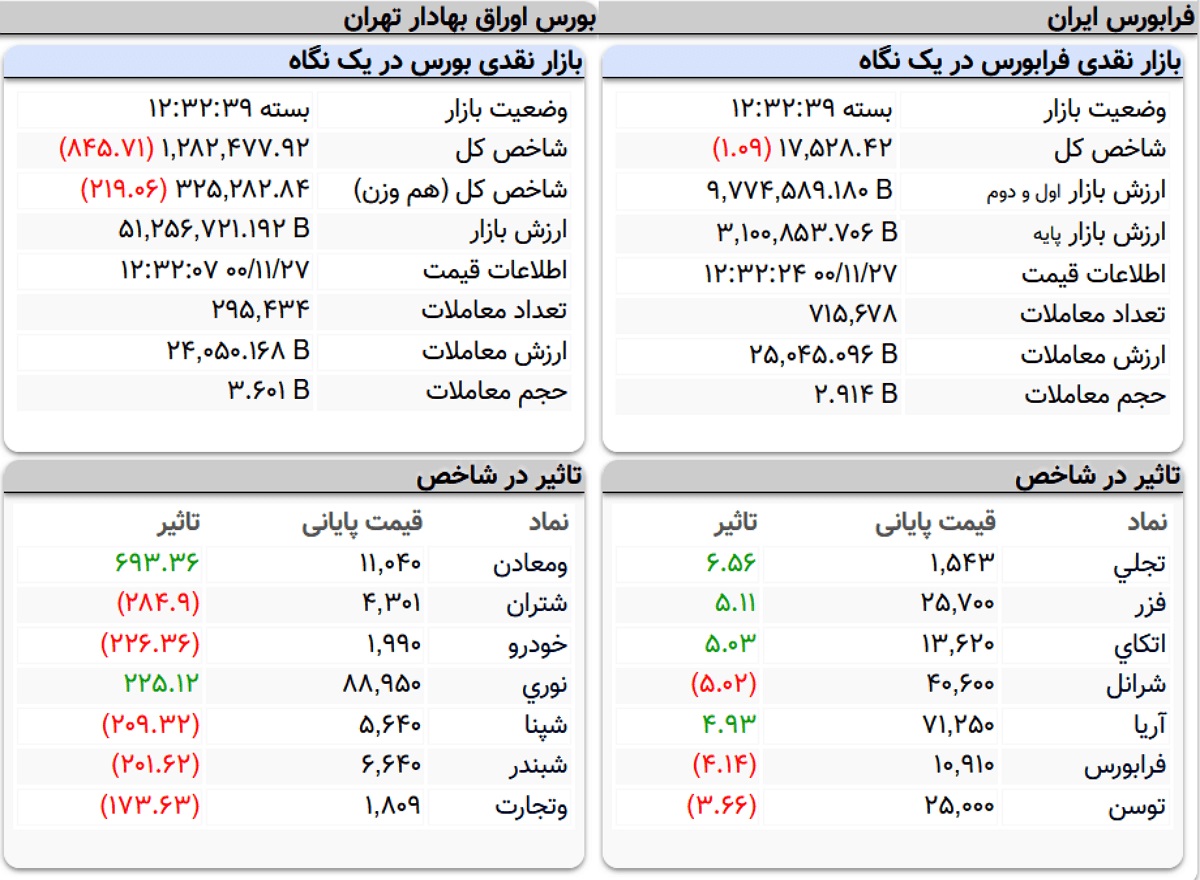 بر اساس این گزارش، در بازارهای فرابورس ایران هم با معامله ۲ میلیارد و ۹۲۸ میلیون ورقه بهارزش ۲ هزار و ۵۶۰ میلیارد تومان در ۷۱۶ هزار نوبت، شاخص فرابورس (آیفکس) یک واحد افت کرد و در ارتفاع ۱۷ هزار و ۵۲۸ واحد قرار گرفت.