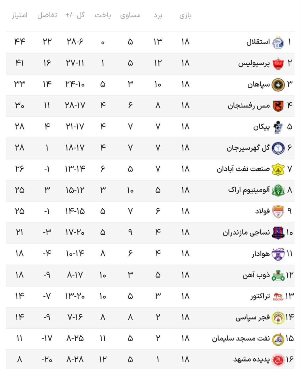 آبیها با شکست تراکتور، امتیازات خود را به عدد 44 رساندند و با میانگین کسب 2.5 امتیاز از هر مسابقه، همچنان صدرنشین مسابقات به شمار میروند. پرسپولیس نیز به سختی بر آلومینیوم غلبه کرد تا با حضور در جایگاه دوم جدول، اختلاف سه امتیازی خود را با استقلال حفظ کند.