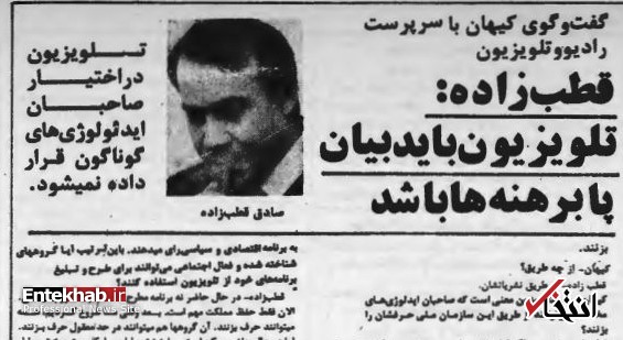 سرویس تاریخ «انتخاب»؛ روز چهارشنبه ۲۵ بهمن ۱۳۵۷، صادق قطبزاده سرپرست وقت رادیو تلویزیون ملی ایران اعلام کرد که از این پس این سازمان اخبار مربوط به گروههای مختلف سیاسی را نخواهد خواند و به جای آنها پیامهای امام خمینی، مشکلات دولت و اخبار ستاد فرماندهی را پخش خواهد کرد. خبرنگار کیهان فردای آن روز طی مصاحبهای از او دربارهی این تصمیم و نیز مشی کلی تلویزیون و... در شرایط تازه پرسید. مشروح گفتوگوی قطبزاده را با خبرنگار کیهان که روز یکشنبه ۲۹ بهمن ۵۷ در این روزنامه منتشر شد در ادامه میخوانید: