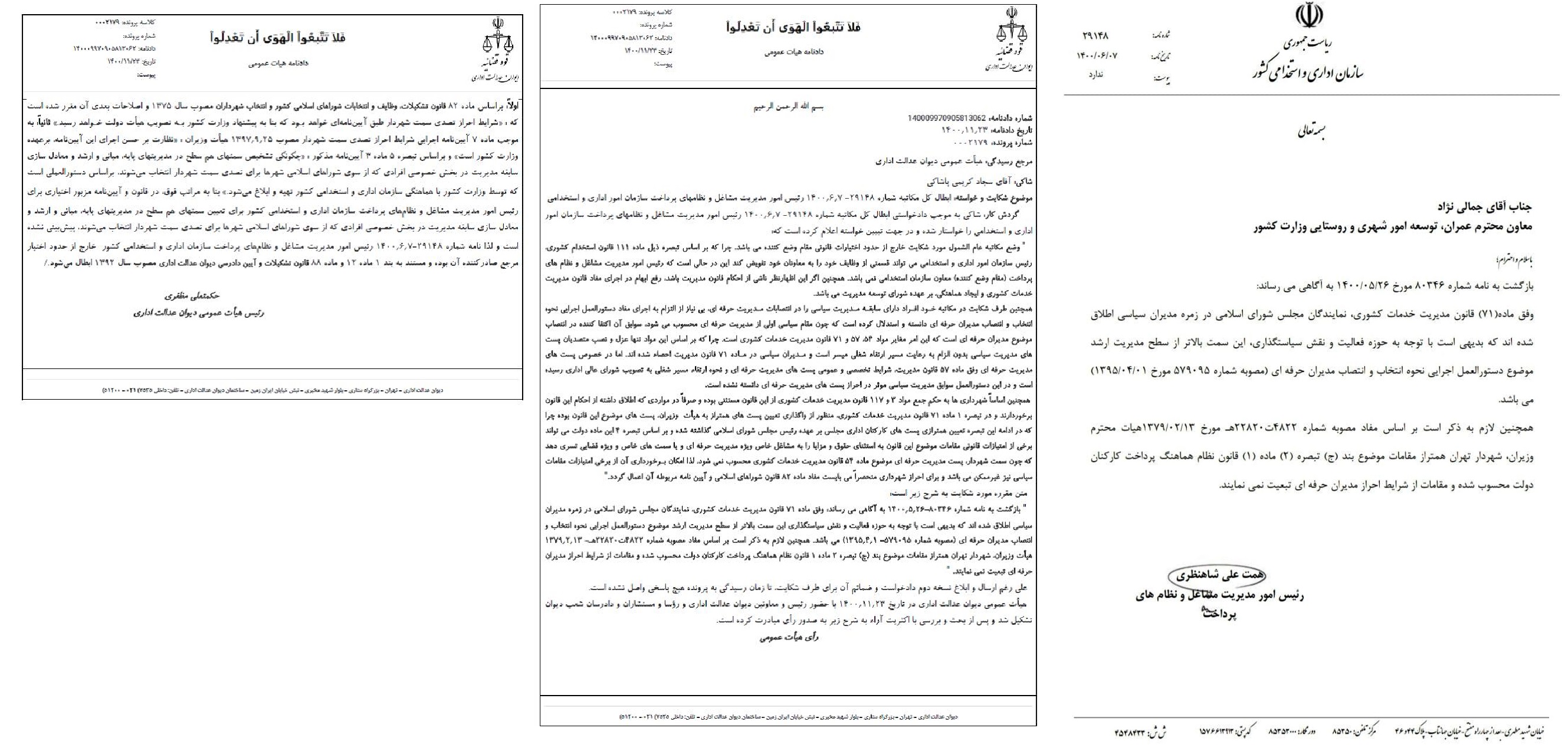 همچنین از نهادهای نظارتی انتظار می رود درباره فرایند صدور نامه سازمان اداری و استخدامی که توسط یک مدیر میانی امضا و مستمسک شهرداری زاکانی شده، تحقیق و نتیجه به اطلاع مردم رسانده شود؛ چرا که مشخص نیست آیا این فرد می توانسته چنین نامه ای بنویسید؟ با کدام استناد قانونی این متن را نوشت و امضا کرد و سایر مسوولانی که آن را پذیرفتند، آیا می توانستند به استناد نامه یک مدیر میانی، نص صریح قانون را کنار بگذارند؟!