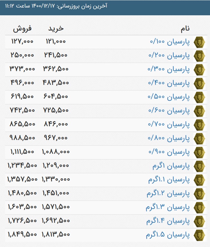 قیمت سکه پارسیان با عیار ۷۵۰ امروز ۱۷ اسفند ۱۴۰۰ به شرح زیر است.