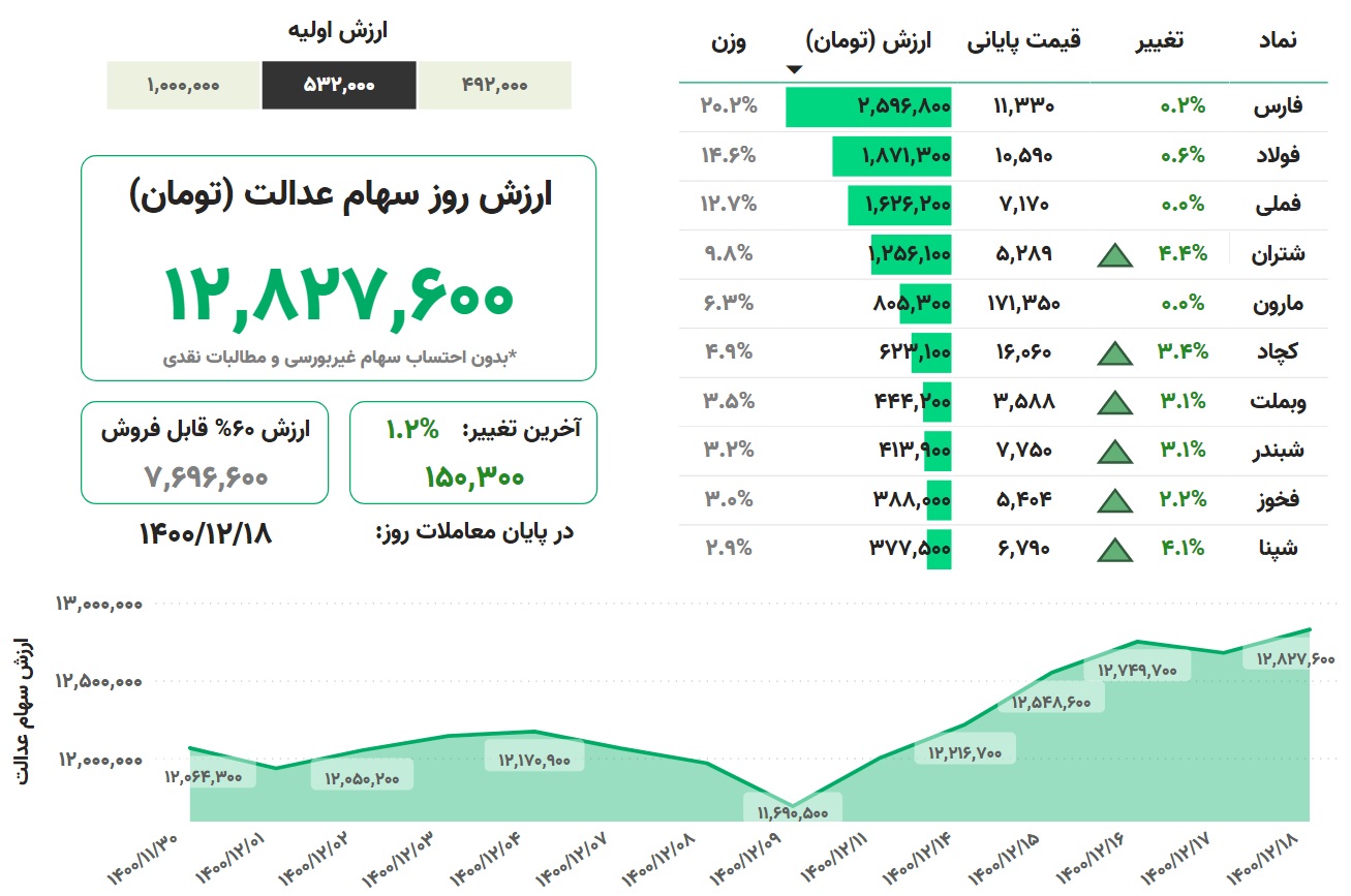 در پایان معاملات امروز بازار سهام، ارزش سهام عدالت در مقایسه با روز گذشته، ۱.۲درصد افزایش یافت و ارزش سبد ۵۳۲هزار تومانی، یک میلیون تومانی و ۴۹۲هزار تومانی سهام عدالت به ترتیب به ۱۲ میلیون و ۸۲۷هزار تومان، ۲۴ میلیون و ۱۶۲هزار تومان و ۱۱ میلیون و ۸۸۸هزار تومان رسید.