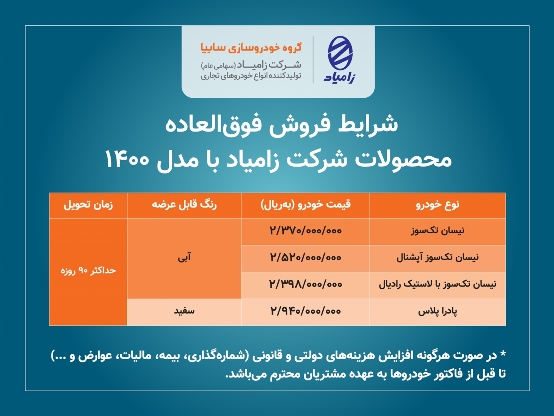 به گزارش سایپا نیوز، شركت زامیاد در راستای آرامش بخشی به بازار و كاهش فاصله قیمت كارخانه و بازار از امروز ساعت 14 فروش فوق العاده 4 محصول خود را آغاز می كند و مشتریان تا تكمیل ظرفیت می توانند برای خودروهای نیسان تك سوز، نیسان تك سوز آپشنال، نیسان تك سوز با لاستیك رادیال و پادرا پلاس ثبت نام كنند.