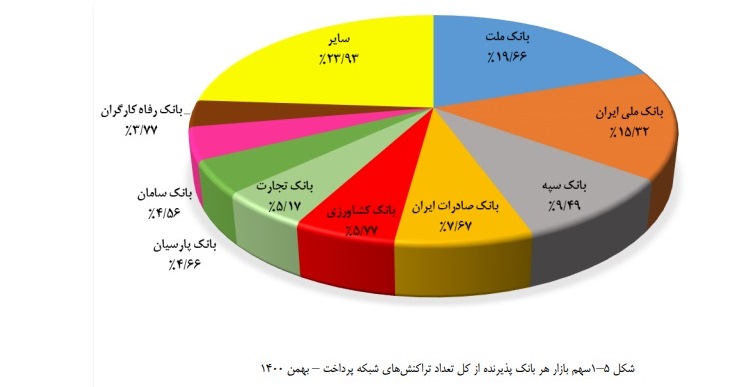 پس از بانک ملت به ترتیب بانکهای ملی، سپه، صادرات، کشاورزی، تجارت، پارسیان، سامان و رفاه کارگران بیشترین سهم را از تعداد تراکنشها و بانکهای ملی، صادرات، سپه، تجارت، کشاورزی، سامان و رفاه، بیشترین سهم را از مبلغ تراکنشهای شبکه پرداخت داشتهاند.