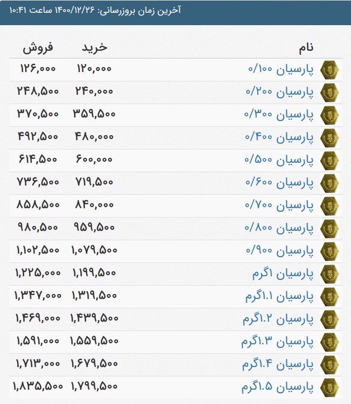 قیمت سکه پارسیان، امروز ۲۶ اسفند ۱۴۰۰