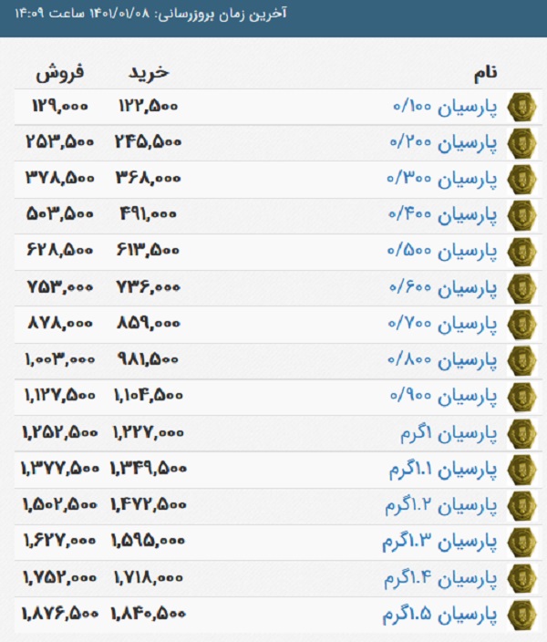 قیمت سکه پارسیان با عیار ۷۵۰ امروز ۸ فروردین ۱۴۰۱ به شرح زیر است.