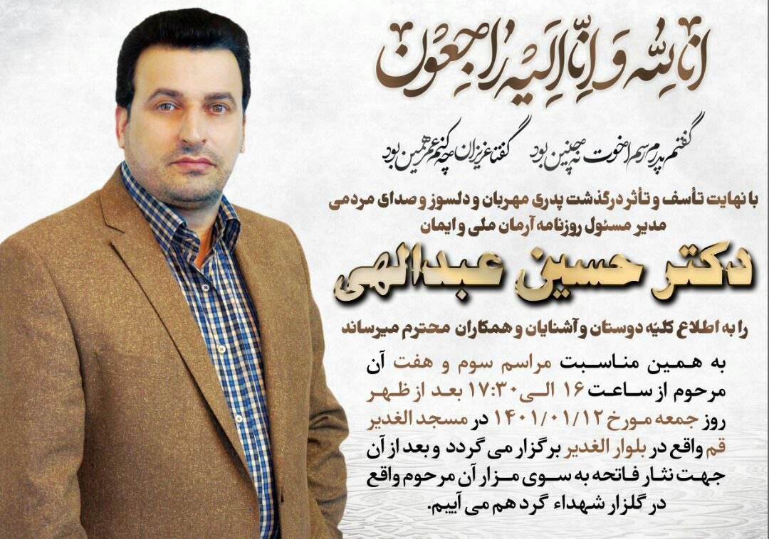 مراسم سوم وشب هفت مرحوم مغفور شادروان حسین عبداللهی، مدیرمسئول روزنامه آرمان ملی ساعت ۱۶ تا ۱۷/۳۰ روز جمعه ۱۲ فروردین ۱۴۰۱ در قم، بلوار الغدیر مسجد الغدیر برگزار می شود.