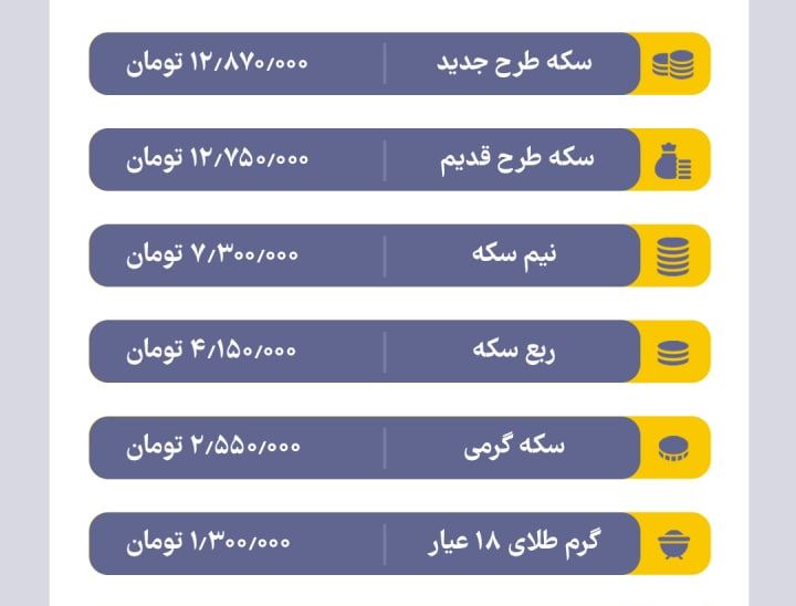 امروز ۱۶ فروردین ۱۴۰۱ قیمت هر گرم طلای ۱۸ عیار یک میلیون و ۳۰۰ هزار تومان، قیمت سکه بهار آزادی ۱۲ میلیون و ۸۷۰ هزار تومان و قیمت سکه طرح قدیم ۱۲ میلیون و ۷۵۰ هزار تومان است.
