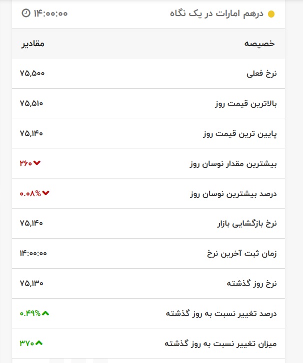 امروز ۲۰ فروردین ۱۴۰۱ درهم امارات ۷ هزار و ۵۵۰ تومان قیمت گذاری شد.