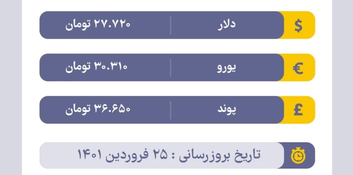 به گزارش «انتخاب»، بر اساس جدولی که ایرنا، خبرگزاری رسمی دولت در کانال تلگرامی خود منتشر کرده، امروز ۲۵ فروردین ۱۴۰۱ قیمت دلار در بازار آزاد ۲۷ هزار و ۷۲۰ تومان، قیمت یورو ۳۰ هزار و ۳۱۰ تومان و قیمت پوند انگلیس ۳۶ هزار و ۶۵۰ است.