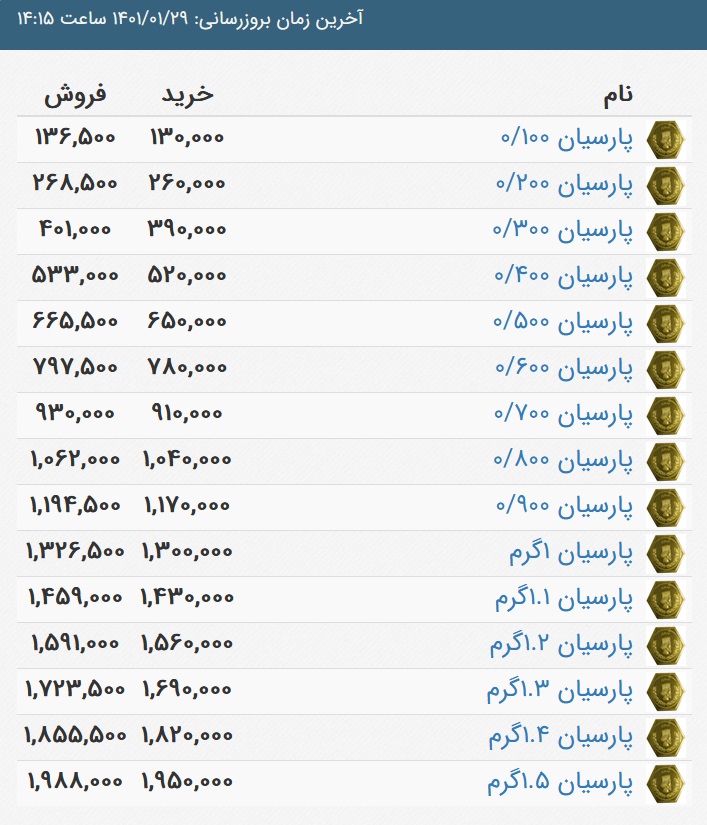قیمت سکه پارسیان با عیار ۷۵۰ امروز ۲۹ فروردین ۱۴۰۱ به شرح زیر است.