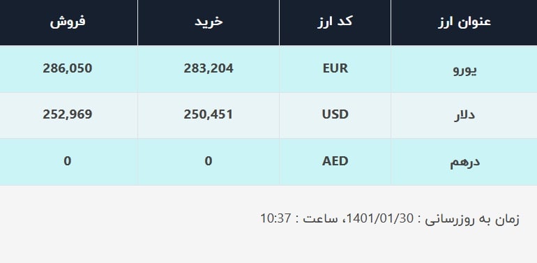 صرافی‌های بانک‌ها صبح امروز ۳۰ فروردین ۱۴۰۱ قیمت دلار را برای فروش به مردم ۲۵۲۹۶۹ ریال اعلام کرده‌اند که نسبت به آخرین قیمت‌های روز کاری گذشته کاهش یافته است. نرخ خرید در این صرافی‌ها نیز ۲۵۰۲۰۴ ریال است.