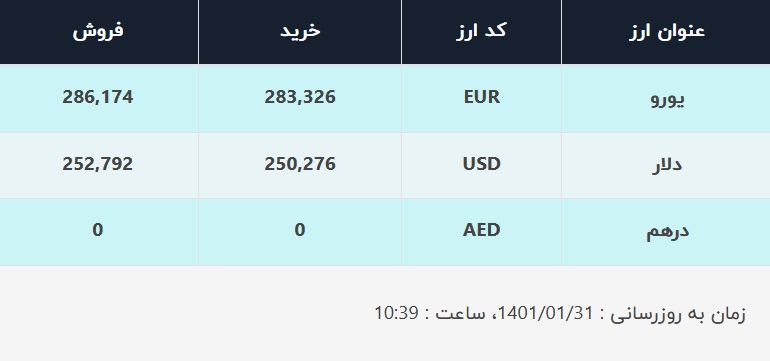 صرافیهای بانکها صبح امروز ۳۱ فروردین ۱۴۰۱ قیمت دلار را برای فروش به مردم ۲۵۲۷۹۲ ریال اعلام کردهاند که نسبت به آخرین قیمتهای روز کاری گذشته افزایش یافته است. نرخ خرید در این صرافیها نیز ۲۵۰۲۷۶ ریال است.