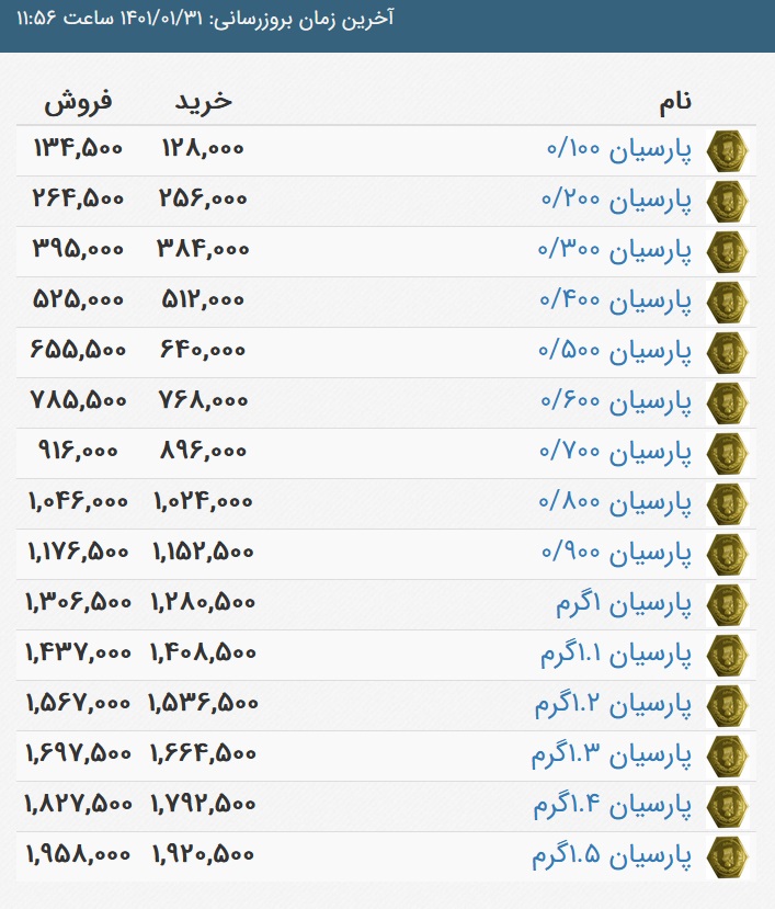 قیمت سکه پارسیان با عیار ۷۵۰ امروز ۳۱ فروردین ۱۴۰۱ به شرح زیر است.