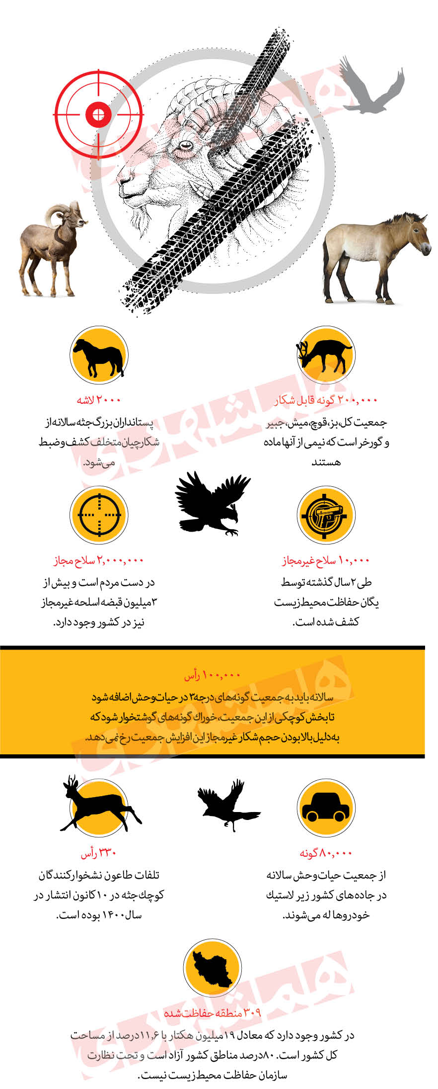 اینفوگرافی / هر سال ۸۰ هزار گونه از جمعیت حیات وحش ایران در جاده‌ها می‌میرند