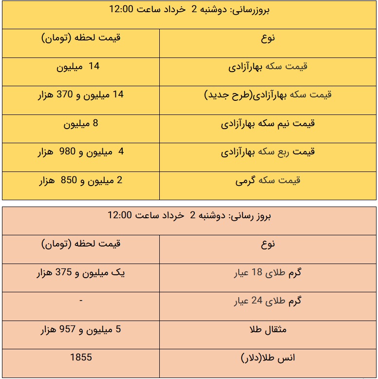 تسنیم: هماکنون در بازار آزاد، قیمت طلای ۱۸ عیار هر گرم یک میلیون و ۳۷۵ هزار تومان، قیمت سکه تمامبهار آزادی طرح قدیم ۱۴ میلیون تومان و قیمت سکه تمامبهار آزادی طرح جدید نیز ۱۴ میلیون و ۳۷۰ هزار تومان است.