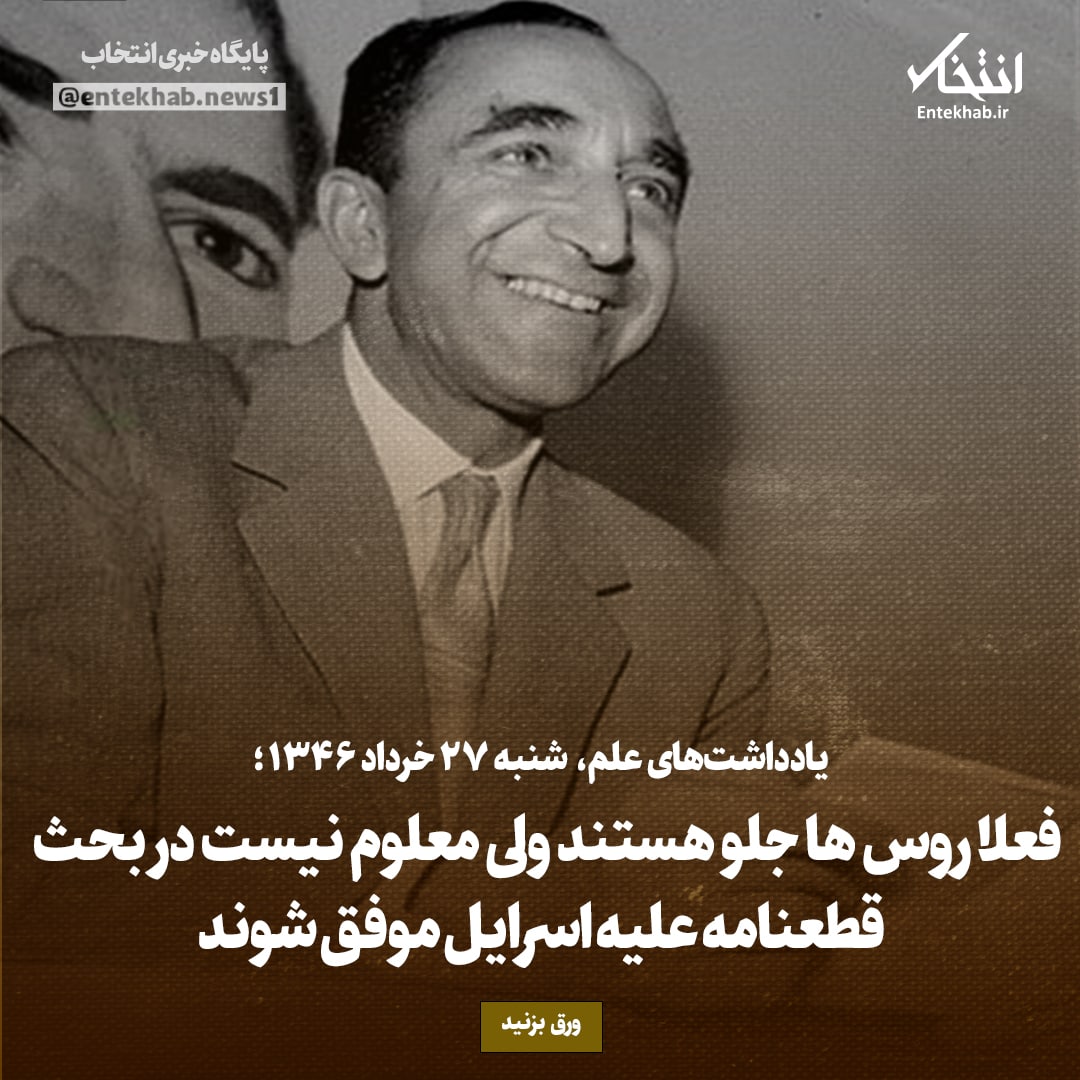 یادداشتهای علم: صبح اسرائیلی ها تلفن کردند که تشکیل مجمع عمومی با شکست مواجه شد، یعنی روسها نتوانستند ۶۲ رأی برای تشکیل مجمع عمومی به دست بیاورند، در صورتی که چنین نبود. به آنها گفتم خودم اخبار گوش کردم، چنین نیست، بعد خودشان تصدیق کردند، امروز بعد از ظهر مجمع عمومی تشکیل شد. آنچه به نظر می رسد فعلا روسها جلو هستند.