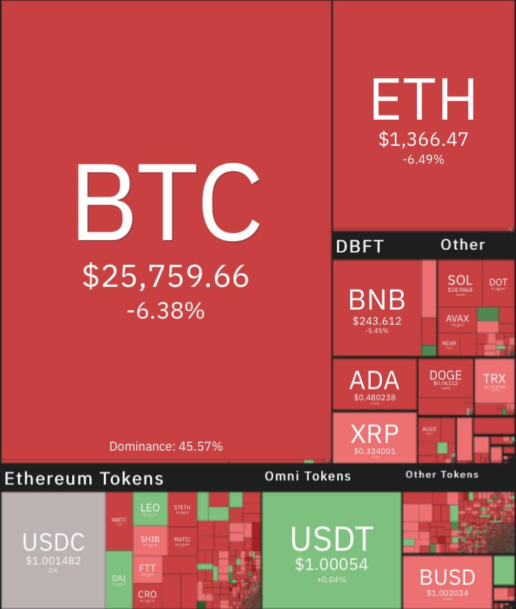 بیتکوین و اتریوم هر دو با ریزش بیش از ۶ درصد به ترتیب به قیمت ۲۵ هزار و ۷۵۹ دلار و هزار و ۳۶۶ دلار معامله میشوند.