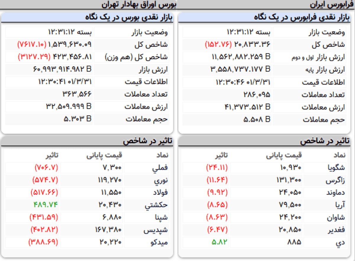 شاخص کل فرابورس هم امروز با ۱۵۲ واحد کاهش در رقم ۲۰ هزار و ۸۳۳ واحد ایستاد. معامله گران این بازار ۲۸۷ هزار معامله به ارزش ۴۲ هزار و ۵۰۵ میلیارد ریال انجام دادند. پتروشیمی تندگویان، پتروشیمی زاگرس، تولید نیروی برق دماوند، پلیمر آریاسول، پالایش نفت لاوان، و آهن و فولاد غدیر ایرانیان نسبت به سایر نمادها بیشترین تاثیر منفی و در مقابل بانک دی نسبت به سایر نمادها بیشترین تاثیر مثبت را روی بورس گذاشتند.