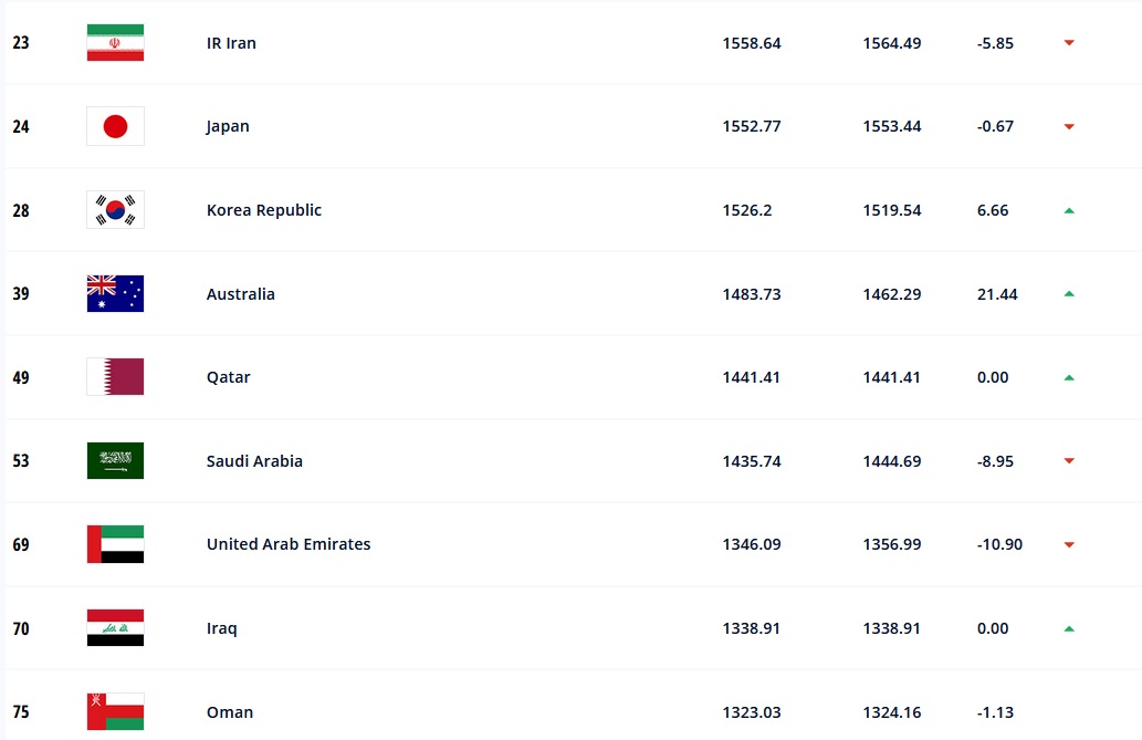ایران با این حال همچنان در صدر فوتبال آسیا قرار دارد و تیمهای ملی ژاپن، کره جنوبی، استرالیا و قطر در ردههای بعدی جای دارند.