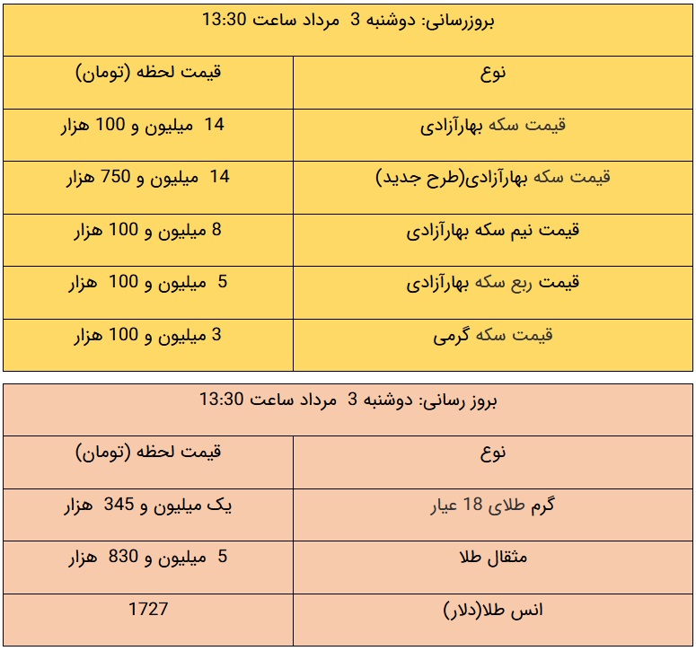 قیمت طلا و سکه، امروز ۳ مرداد ۱۴۰۱