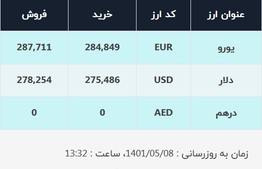 قیمت فروش یورو نیز در صرافیهای بانکها، ۲۸۷۷۱۱ ریال و نرخ خرید آن ۲۸۴۸۴۹ ریال ریال اعلام شده است.