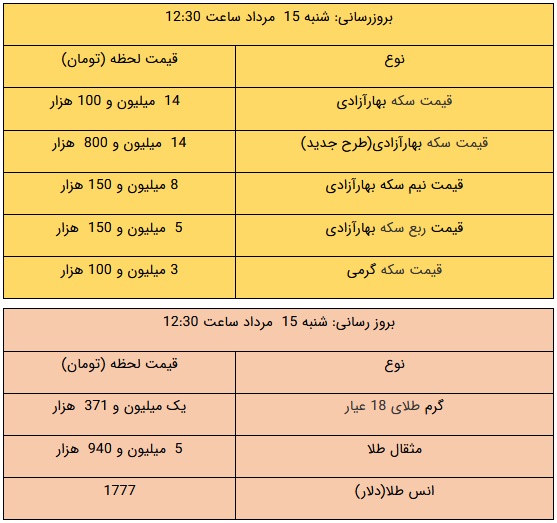 قیمت طلا و سکه، ۱۵ مرداد ۱۴۰۱
