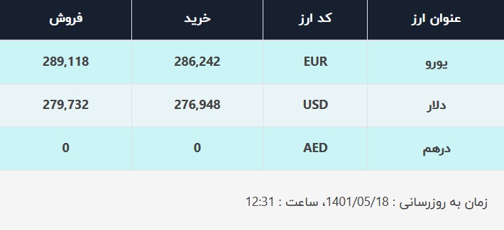 قیمت فروش یورو نیز در صرافیهای بانکها، ۲۸۹۱۱۸ ریال و نرخ خرید آن ۲۸۶۲۴۲ ریال ریال اعلام شده است.