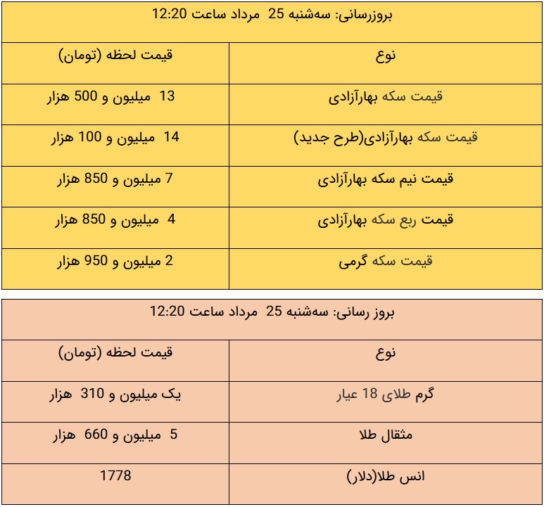 هماکنون در بازار آزاد، قیمت طلای ۱۸ عیار هر گرم یک میلیون و ۳۱۰ هزار تومان، قیمت سکه تمامبهار آزادی طرح قدیم ۱۳ میلیون و ۵۰۰ هزار تومان و قیمت سکه تمامبهار آزادی طرح جدید نیز ۱۴ میلیون و ۱۰۰ هزار تومان است.