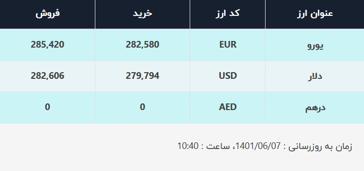صرافی‌های بانک‌ها صبح امروز ۷ شهریور ۱۴۰۱ قیمت دلار را برای فروش به مردم ۲۸۲۶۰۶ ریال اعلام کرده‌اند که نسبت به آخرین قیمت‌های روز کاری گذشته تغییری نکرده است. نرخ خرید در این صرافی‌ها نیز ۲۷۹۷۹۴ است.