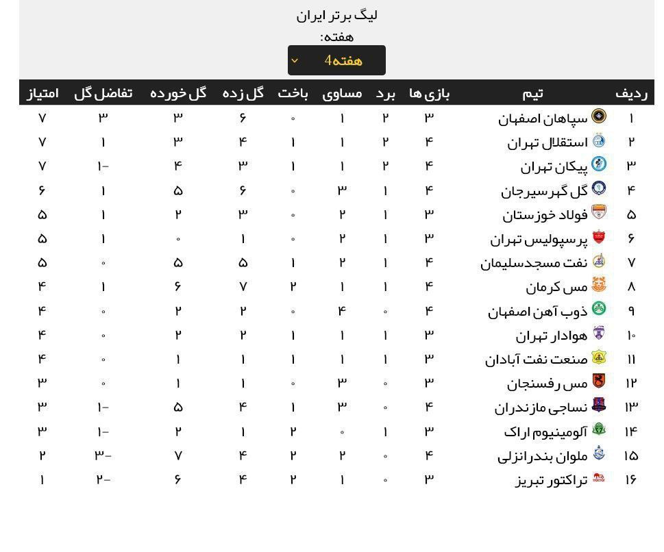 جدول لیگ برتر در هفته چهارم؛ آبی‌ها نتوانستند جای سپاهان را در صدر جدول بگیرند / تراکتور قعرنشین شد