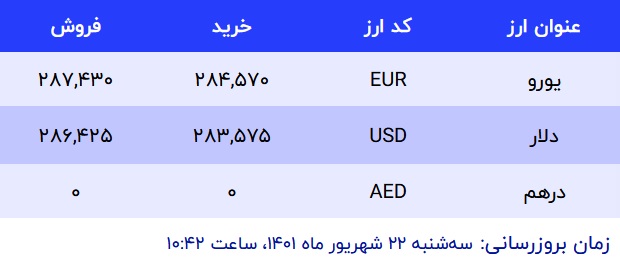 صرافیهای بانکها صبح امروز ۲۲ شهریور ۱۴۰۱ قیمت دلار را برای فروش به مردم ۲۸۶۴۲۵ ریال اعلام کردهاند که نسبت به آخرین قیمتهای روز کاری گذشته تغییری نکرده است. نرخ خرید در این صرافیها نیز ۲۸۳۵۷۵ است.