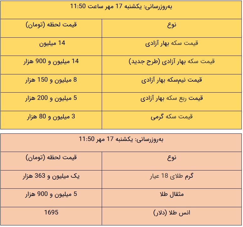 هماکنون در بازار آزاد، قیمت طلای 18عیار هر گرم یک میلیون و 363 هزار تومان، قیمت سکه تمامبهار آزادی طرح قدیم 14 میلیون تومان و قیمت سکه تمامبهار آزادی طرح جدید نیز 14 میلیون و 900 هزار تومان است.