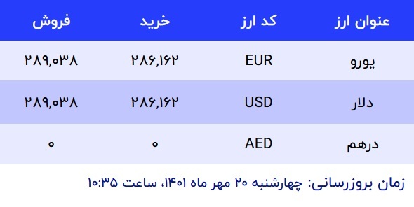 قیمت فروش یورو نیز در صرافی‌های بانک‌ها، ۲۸۹۰۳۸ ریال و نرخ خرید آن ۲۸۶۱۶۲ ریال اعلام شده است.