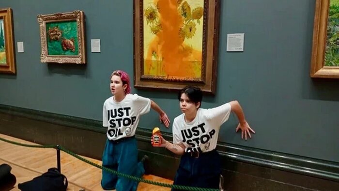 دو طرفدار محیط زیست و معترض به چرخه سوخت فسیلی در گالری ملی لندن بر روی تابلونقاشی گرانقیمت و معروف «گلهای آفتابگردان» اثر ونسان ونگوگ سوپ گوجهفرنگی ریختند و دستان خود را با چسب به دیوار گالری چسباندند.