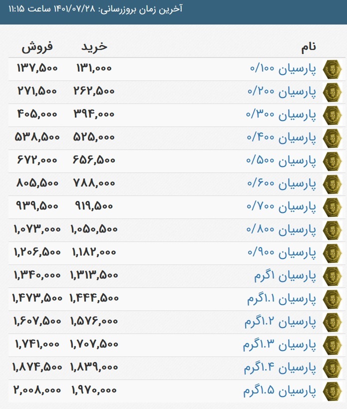 قیمت سکه پارسیان با عیار ۷۵۰ امروز ۲۸ مهر ۱۴۰۱ به شرح زیر است.