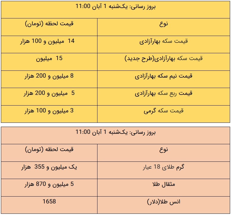 هماکنون در بازار آزاد، قیمت طلای ۱۸ عیار هر گرم یک میلیون و ۳۵۵ هزار تومان، قیمت سکه تمامبهار آزادی طرح قدیم ۱۴ میلیون و ۱۰۰ هزار تومان و قیمت سکه تمامبهار آزادی طرح جدید نیز ۱۵ میلیون تومان است.