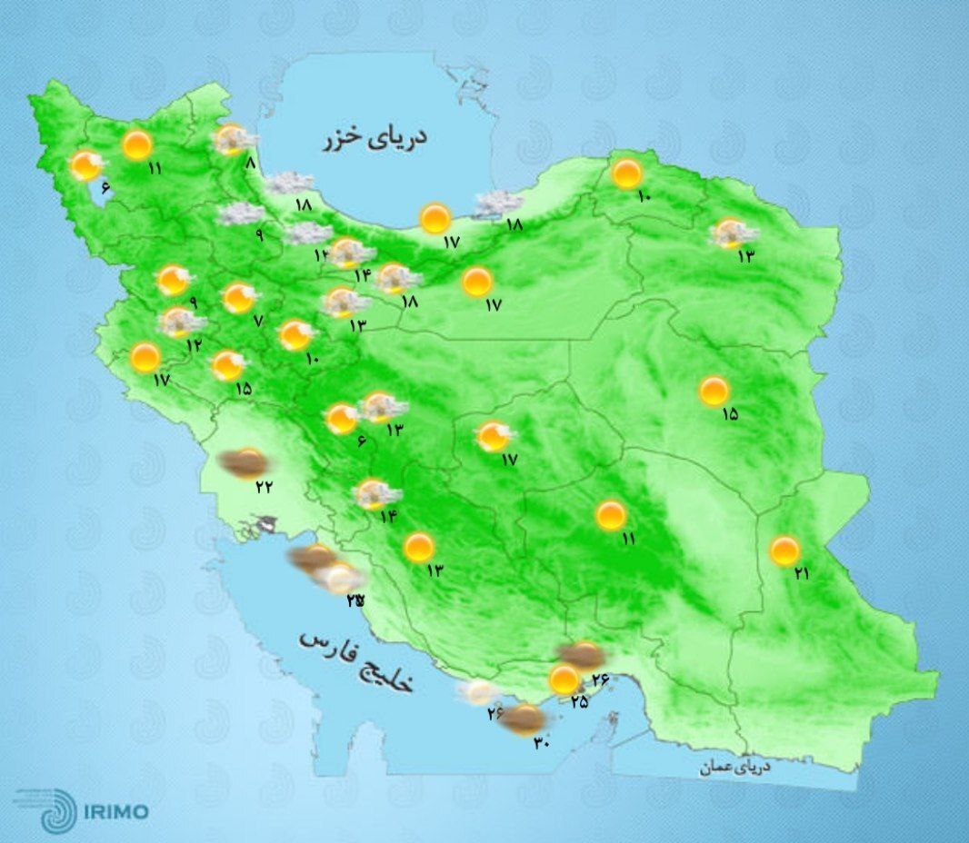دمای هوا امروز و فردا 4 تا 8 درجه در نوار شمالی کشور کاهش مییابد. همچنین امروز شرایط برای تشکیل توده گردوخاک روی عراق و انتقال آن به استانهای مرزی در غرب و جنوب غرب کشور فراهم است. دوشنبه آینده در دامنههای جنوبی البرز، شمال غرب، غرب، جنوب غرب و مرکز و سهشنبه علاوه بر این مناطق در شمال شرق و جنوب شرق کشور سرعت وزش باد افزایش یافته و در برخی از این مناطق با خیزش گردوخاک همراه است.