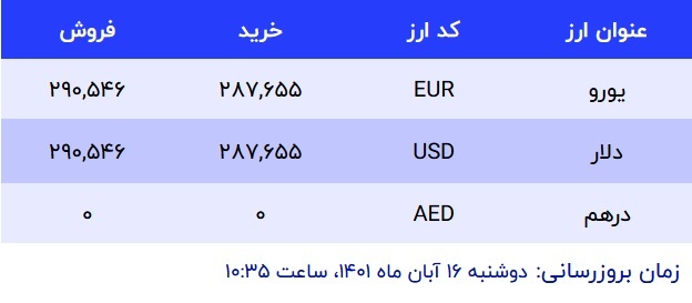 صرافی‌های بانک‌ها صبح امروز ۱۶ آبان ۱۴۰۱ قیمت دلار را برای فروش به مردم ۲۹۰۵۴۶ ریال اعلام کرده‌اند که نسبت به آخرین قیمت‌های روز کاری گذشته افزایش یافته است. نرخ خرید در این صرافی‌ها نیز ۲۸۷۶۵۵ است.