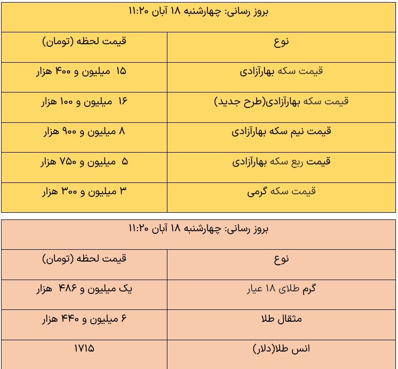 قیمت طلا و سکه، امروز ۱۸ آبان ۱۴۰۱