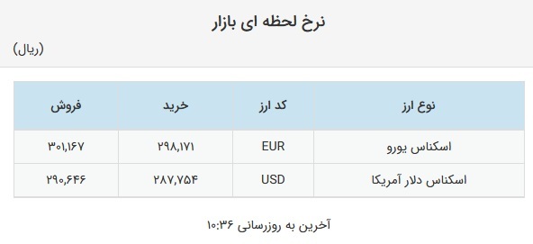 قیمت فروش یورو نیز در صرافیهای بانکها، ۳۰۱۱۶۷ ریال و نرخ خرید آن ۲۹۸۱۷۱ ریال اعلام شده است.