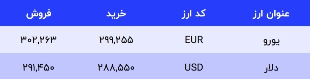 قیمت فروش یورو نیز در صرافی‌های بانک‌ها، ۳۰۲۲۶۳ ریال و نرخ خرید آن ۲۹۹۲۵۵ ریال اعلام شده است.