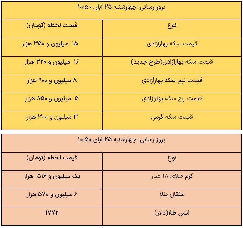 قیمت طلا و سکه، امروز ۲۵ آبان ۱۴۰۱