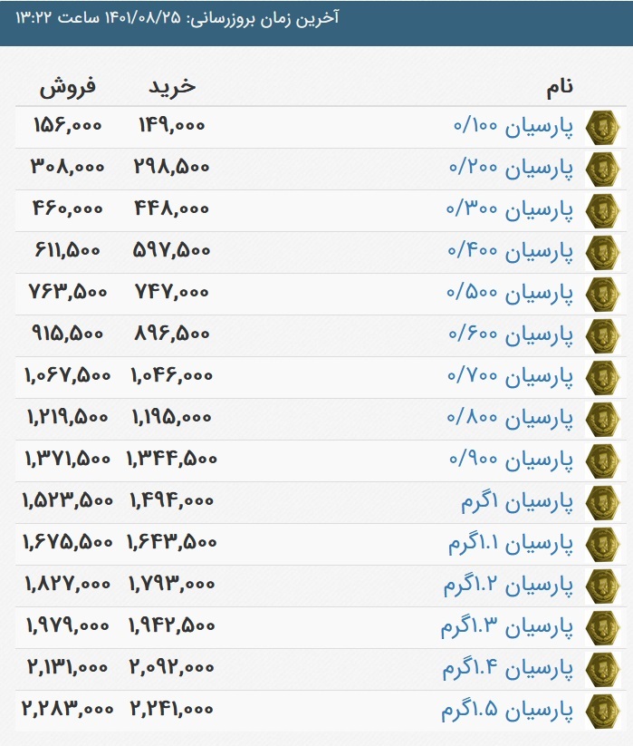 قیمت سکه پارسیان با عیار ۷۵۰ امروز ۲۵ آبان ۱۴۰۱ به شرح زیر است.